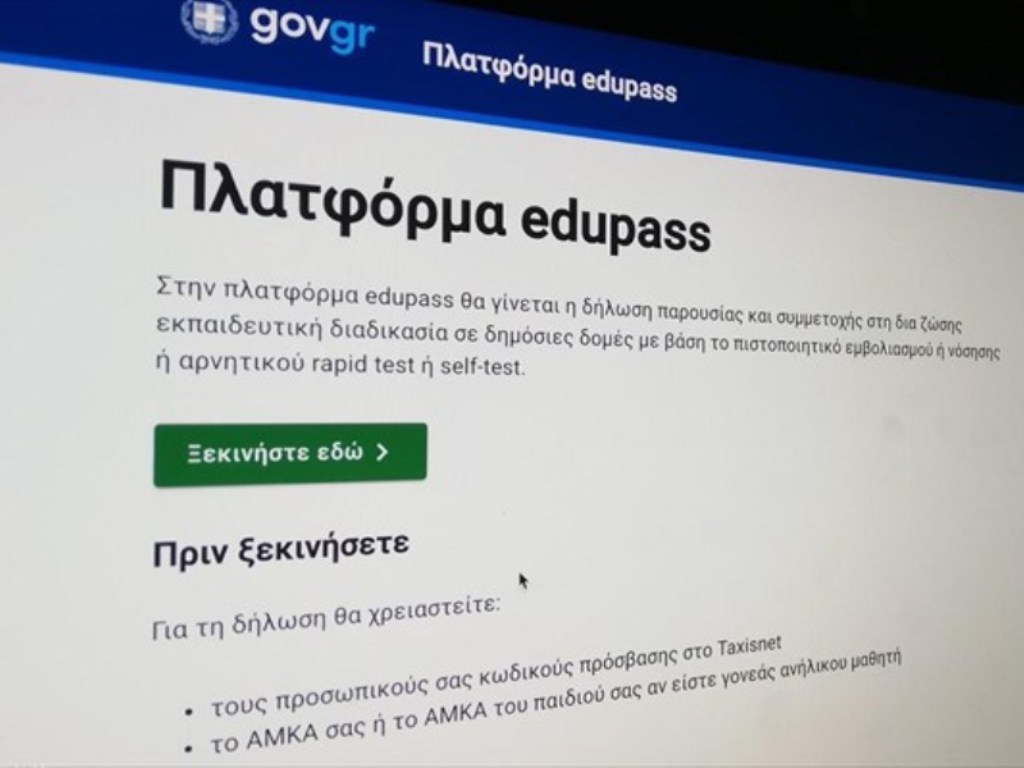 Από τη Δευτέρα 1 Νοεμβρίου 2021 τίθεται σε λειτουργία για τις δημόσιες σχολικές μονάδες η πλατφόρμα edupass.gov.gr, η οποία αποτελεί ένα επιπλέον εργαλείο για την υγειονομική θωράκιση της δια ζώσης λειτουργίας των δημόσιων εκπαιδευτικών δομών.