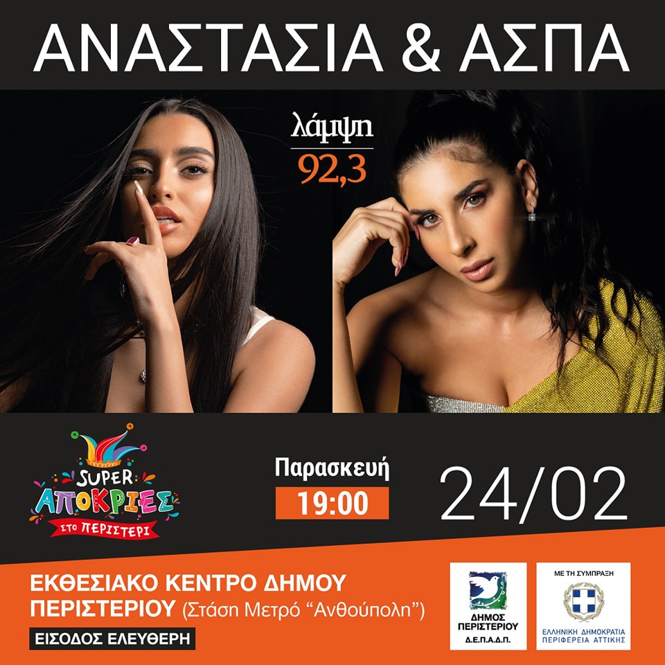 Την Παρασκευή 24 Φεβρουαρίου θα τραγουδήσουν στο Εκθεσιακό κέντρο δύο νέες και πολλά υποσχόμενες Ελληνίδες τραγουδίστριες, η Αναστασία και η Άσπα.