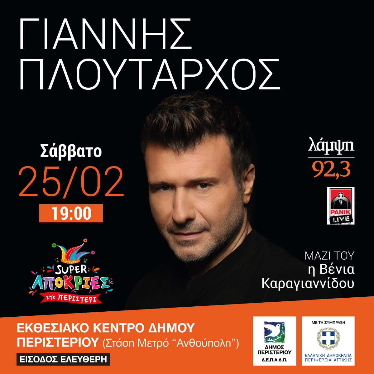 Η μεγαλύτερη των συναυλιών που θα πραγματοποιηθούν στις φετινές Αποκριές θα γίνει το Σάββατο 25 Φεβρουαρίου με τον Γιάννη Πλούταρχο να έρχεται στο Περιστέρι με σκοπό να πλημμυρίσει το Εκθεσιακό. Μαζί του θα είναι η Βένια Καραγιαννίδου και η συναυλία θα ξεκινήσει στις 19.00.