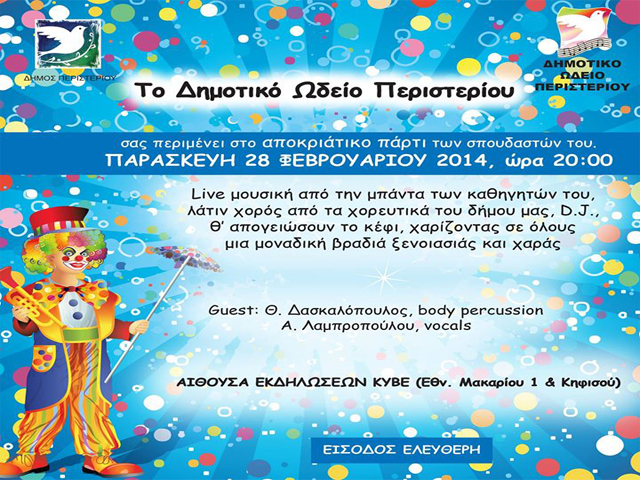 Αποκριάτικο πάρτι με πολλή μουσική (live και από DJ) και latin χορό διοργανώνει το Δημοτικό Ωδείο Περιστερίου την Παρασκευή 28 Φεβρουαρίου στις 20:00 στην αίθουσα εκδηλώσεων ΚΥΒΕ (Εθν. Μακαρίου 1 & Κηφισού), με τη συμμετοχή της μπάντας των καθηγητών του Ωδείου και των χορευτικών συγκροτημάτων του Δήμου αλλά και με guests τους: Θ. Δασκαλόπουλο (body percussion) και Α. Τουμπανάκη (voice). Η είσοδος είναι ελεύθερη.