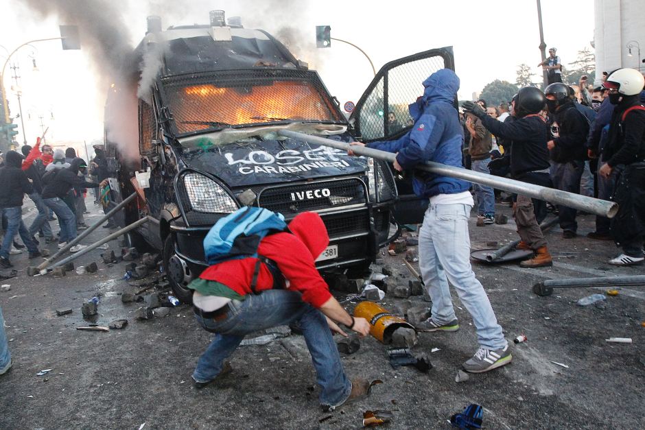 Ως «Σάββατο της τρέλας» χαρακτήρισαν οι Ιταλοί τη χθεσινή ημέρα, λόγω των εκτεταμένων επεισοδίων που αμαύρωσαν την εικόνα της πόλης και την ειρηνική -κατά τ’ άλλα- πορεία των εξοργισμένων πολιτών.