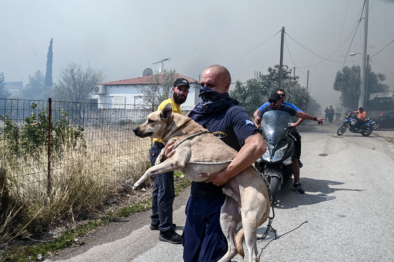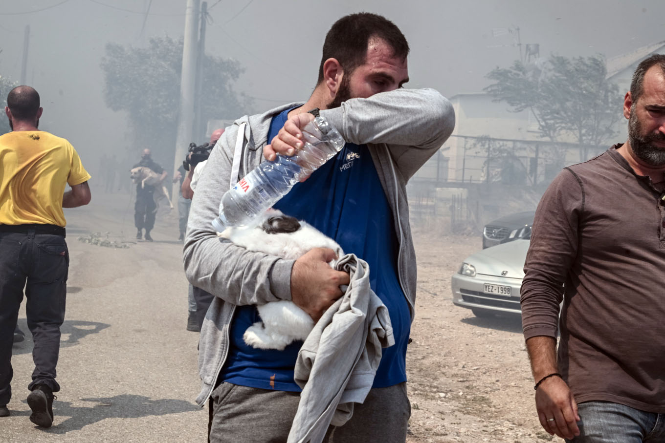 Κάτοικοι αλλά και εθελοντές κρατούν στην αγκαλιά τους ζωάκια προκειμένου να τα απομακρύνουν από τις φλόγες και να τα σώσουν από την πύρινη λαίλαπα.
