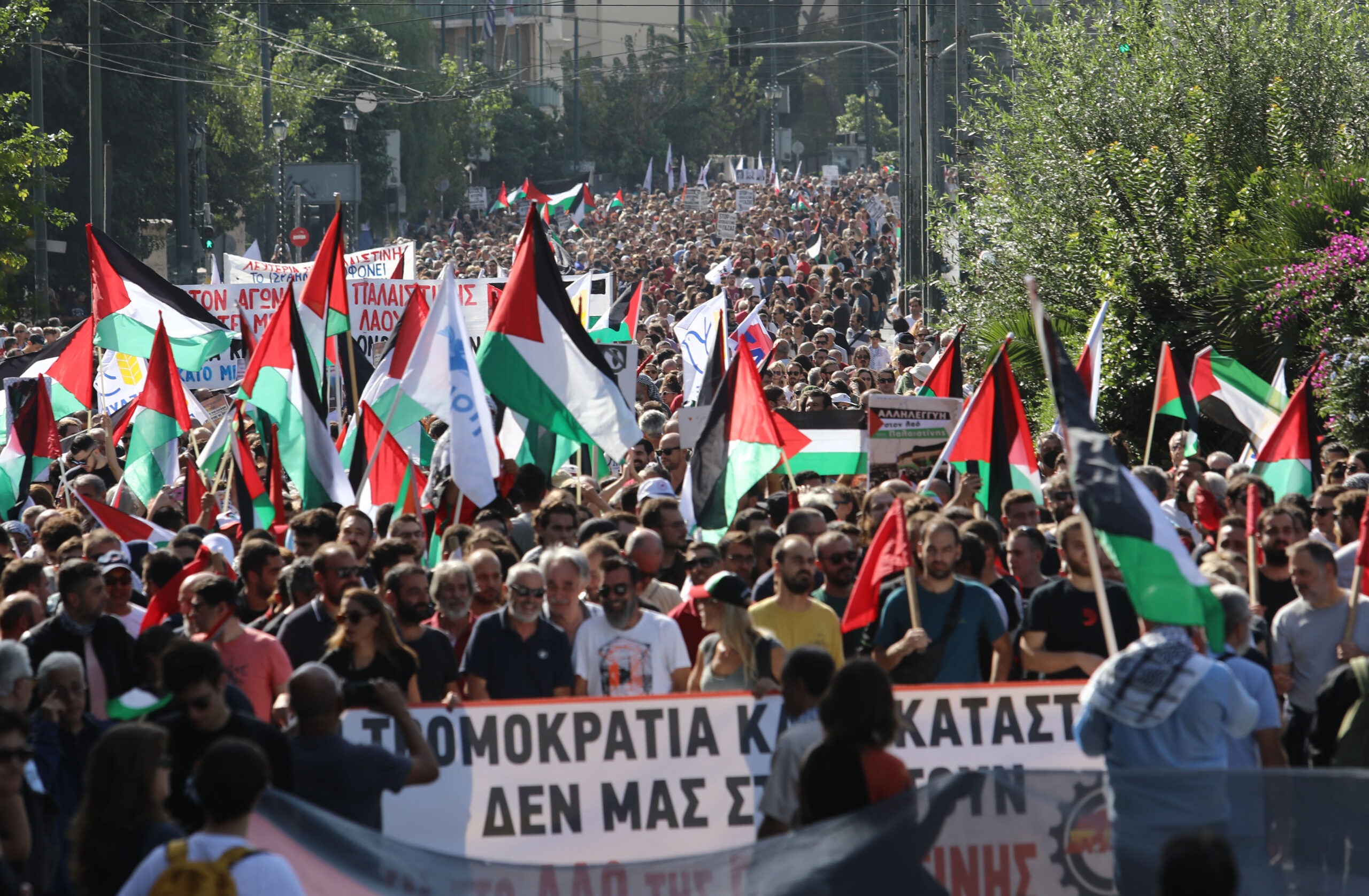 «Αγωνιζόμαστε για την ειρήνη των λαών. Για τερματισμό της ισραηλινής κατοχής. Για Παλαιστίνη ελεύθερη στα σύνορα του 1967 με πρωτεύουσα την Ανατολική Ιερουσαλήμ» ακούγεται από τα μεγάφωνα της συγκέντρωσης.