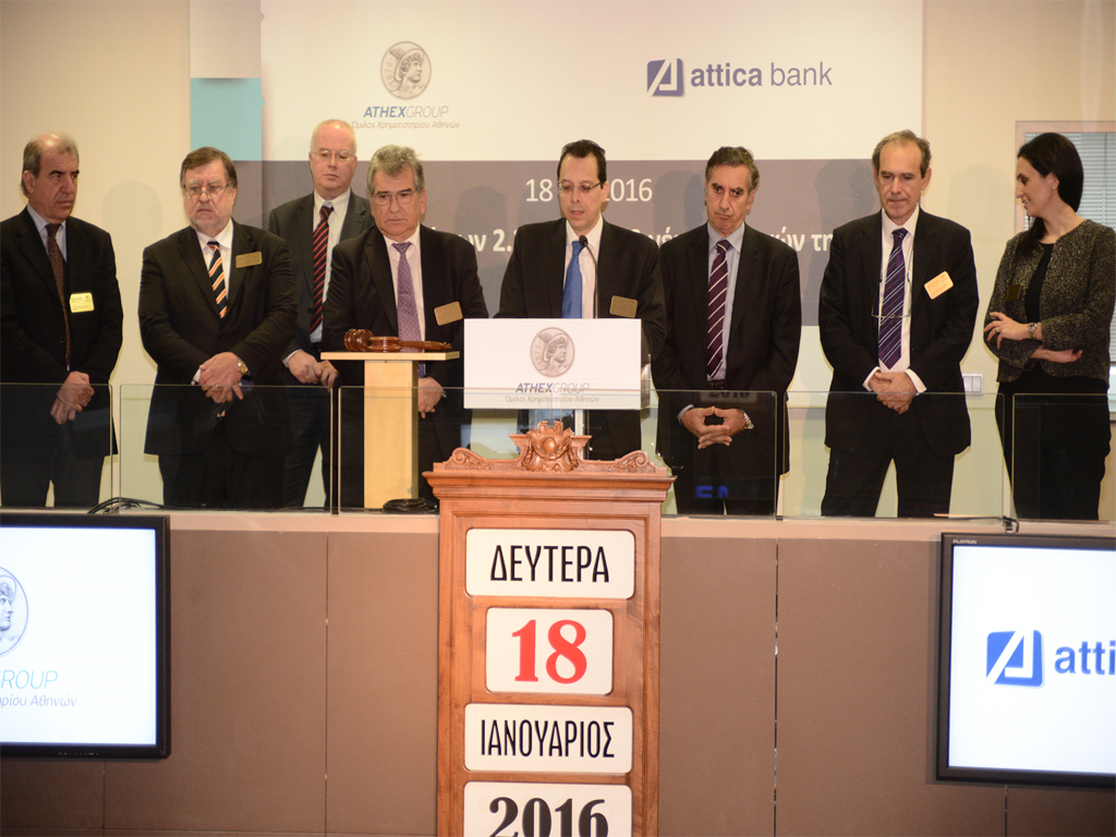 Mε την ευκαιρία της εισαγωγής των 2.270.026.033 νέων κοινών ονομαστικών μετοχών που προέκυψαν από την Αύξηση του Μετοχικού Κεφαλαίου της Attica Bank, o Πρόεδρος του Δ.Σ. κ. Ιωάννης Γαμβρίλης και ο Διευθύνων Σύμβουλος κ. Αλέξανδρος Αντωνόπουλος, κήρυξαν την έναρξη της συνεδρίασης του Χρηματιστηρίου Αθηνών της Δευτέρας 18 Ιανουαρίου 2016.