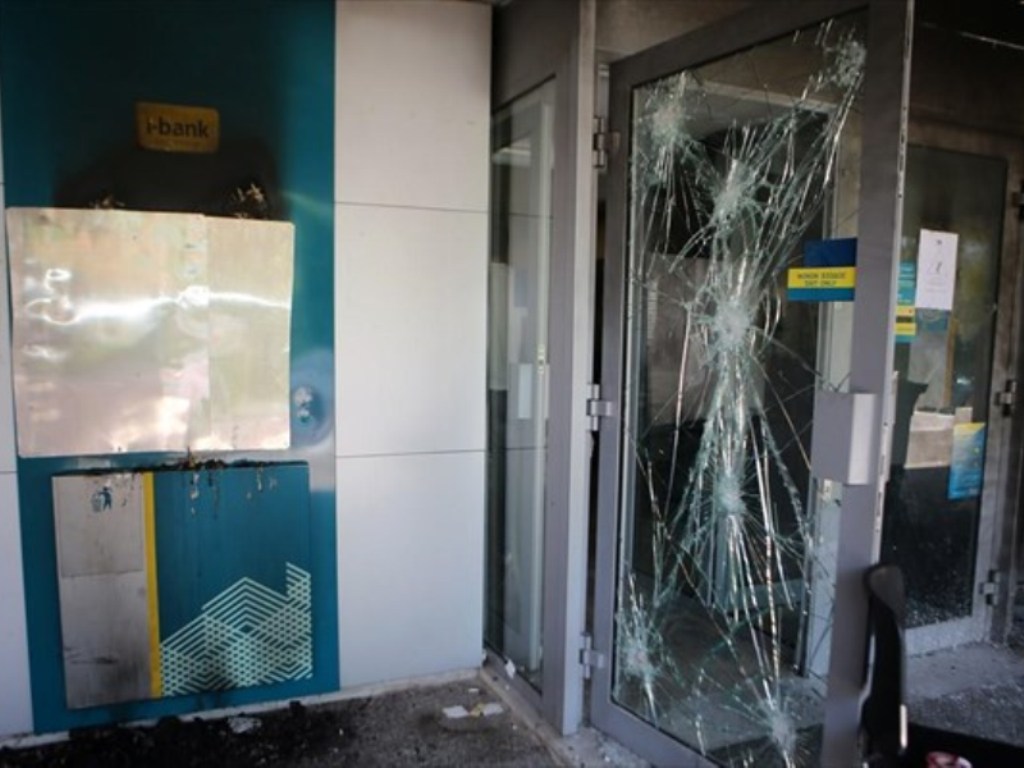 Οι δράστες, από τις 02.30 έως τις 02.50, με βαριοπούλες και άλλα αντικείμενα προξένησαν ραγίσματα στους υαλοπίνακες και στα ΑΤΜ, σε:
