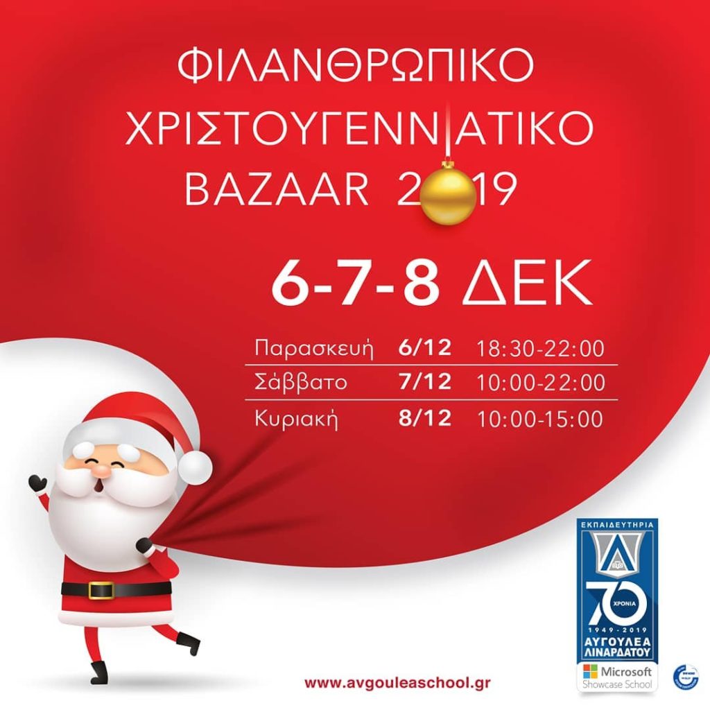 Για 14η χρονιά τα Εκπαιδευτήρια Αυγουλέα-Λιναρδάτου σας προσκαλούν στη μεγάλη ανθρωπιστική γιορτή του σχολείου, το τριήμερο Χριστουγεννιάτικο Φιλανθρωπικό Bazaar!