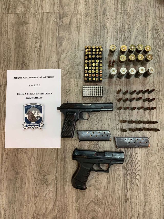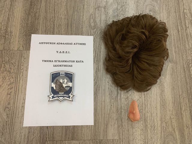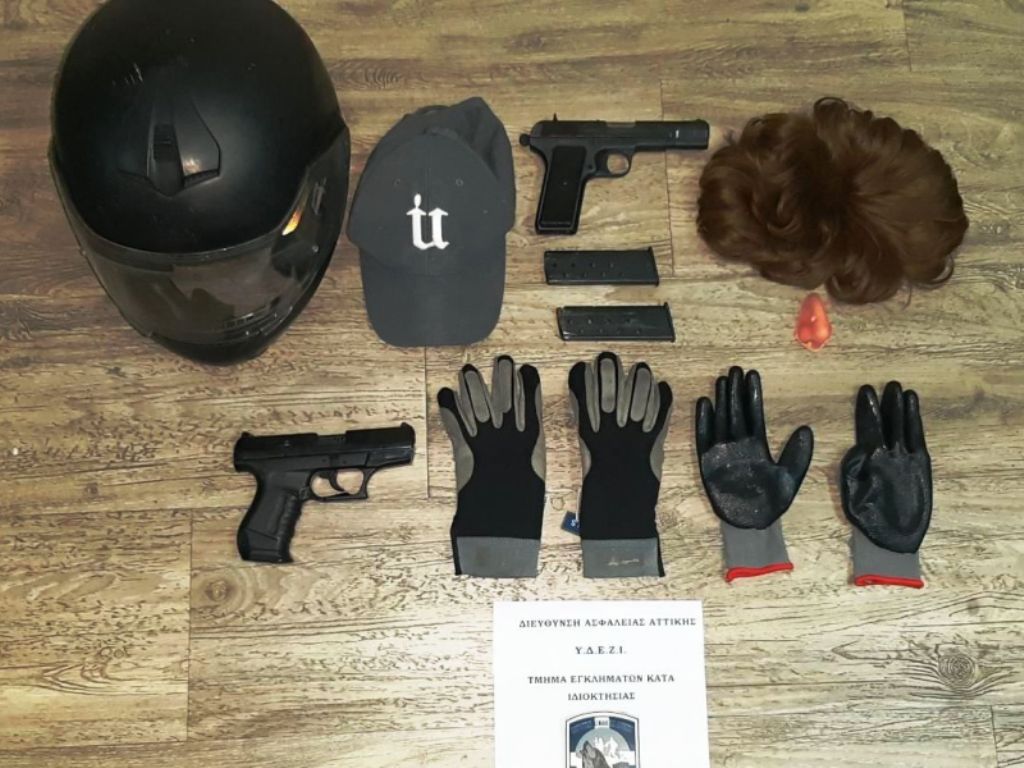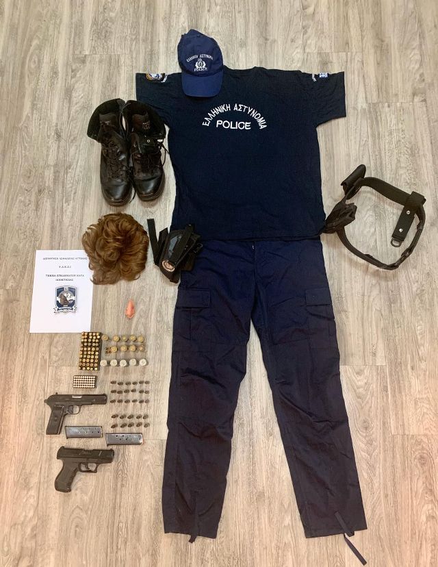 Στο αυτοκίνητο που χρησιμοποιούσαν καθώς και από τις κατ’ οίκον έρευνες, βρέθηκαν και κατασχέθηκαν πιστόλι και πιστόλι-ρέπλικα, πλήθος φυσιγγίων, διάφορα είδη μεταμφίεσης (περούκα, μύτη σιλικόνης), διάφορα είδη ένδυσης (ρούχα, καπέλα, γυαλιά ηλίου, γάντια), στολή αστυνομικού, σφυράκι θραύσης τζαμιών, κράνος μηχανής, κινητά τηλέφωνα και 150 ευρώ.