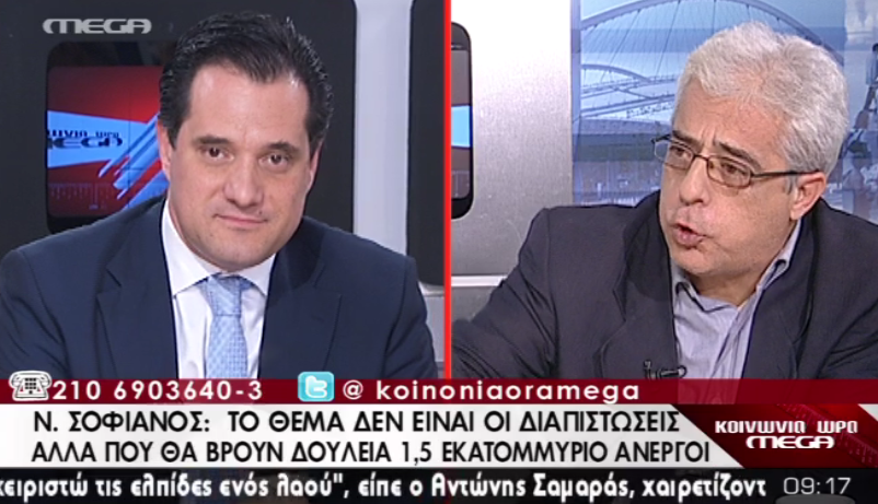 Οι αιχμές του κυρίου Σοφιανού για τα οικονομικά της ΝΔ εξόργισαν τον Άδωνι Γεωργιάδη , ο οποίος κατηγόρησε το ΚΚΕ ότι «στέλνει το ΠΑΜΕ σε κάθε επιχείρηση που απολύει εργαζομένους, την ίδια στιγμή που εφαρμόζουν το Μνημόνιο απολύοντας κόσμο από τον Ριζοσπάστη».