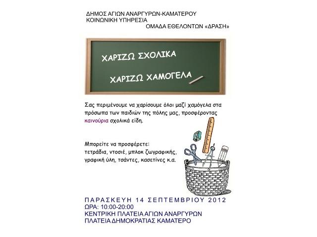 Λίγο πριν να χτυπήσει το κουδούνι που θα σημάνει την έναρξη της νέας σχολικής χρονιάς, η Κοινωνική Υπηρεσία του Δήμου Αγίων Αναργύρων Καματερού σας προσκαλεί να χαρίσετε χαμόγελα στα παιδιά που έχουν ανάγκη χαρίζοντάς τους σχολικά.