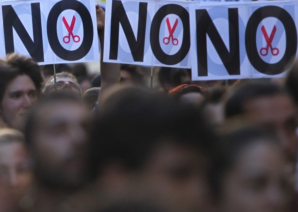 Χιλιάδες άνθρωποι βγήκαν στους δρόμους για να διαμαρτυρηθούν κατά των μέτρων λιτότητας που αποφάσισε η κυβέρνηση Ραχόι ως αντάλλαγμα για την ανακεφαλαιοποίηση των τραπεζών.