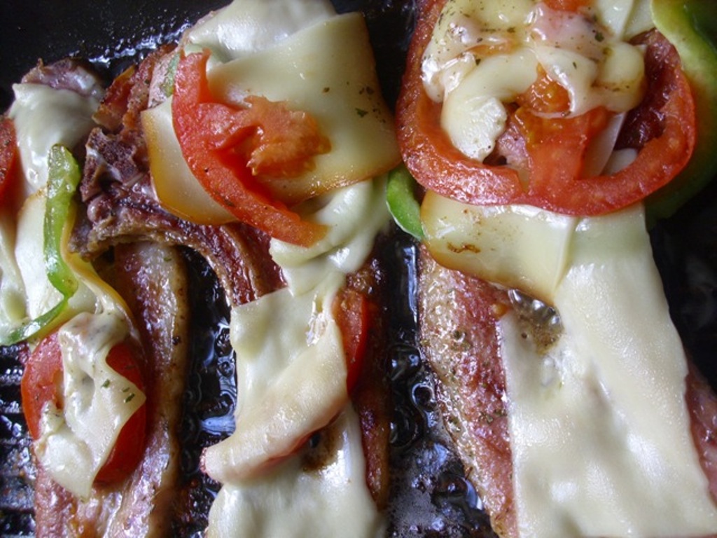 Βάζουμε τις μπριζόλες σε ένα ταψί μαζί με τις πιπεριές και την ντομάτα, το αλάτι και το πιπέρι.
