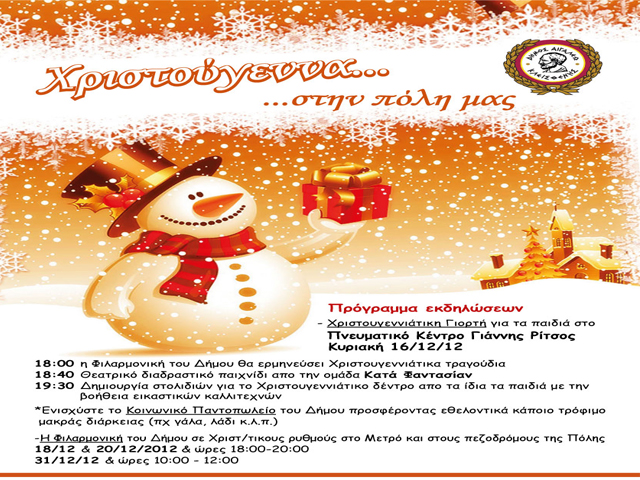 Ο Δήμος Αιγάλεω διοργανώνει, την Κυριακή 16 Δεκεμβρίου 2012 στο πνευματικό κέντρο Γ. Ρίτσος χριστουγεννιάτικη γιορτή για τους μικρούς δημότες (5-12 ετών).