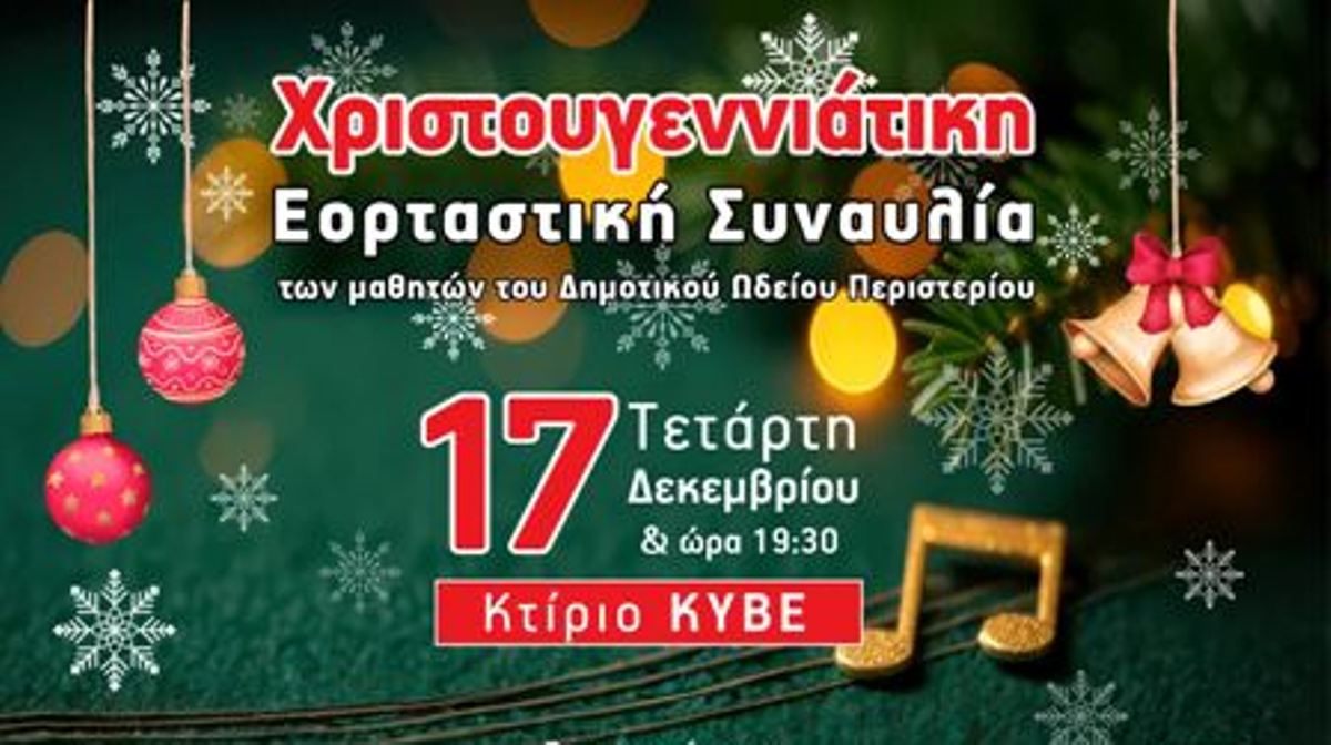 Σε μια ξεχωριστή Χριστουγεννιάτικη εορταστική συναυλία προσκαλεί τους πολίτες ο Δήμαρχος Περιστερίου, με τη συμμετοχή των μαθητών του Δημοτικού Ωδείου Περιστερίου.