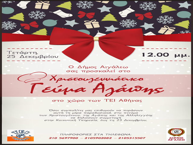 Ο Δήμος Αιγάλεω σε συνεργασία με τα ΤΕΙ Αθήνας και το Προσωπικό της Ελληνικής Αστυνομίας διοργανώνει τη Μέρα των Χριστουγέννων Γεύμα Αγάπης για όσους συμπολίτες μας επιθυμούν να περάσουν αυτή τη μέρα παραδοσιακά, στο Πνεύμα των Χριστουγέννων, της Αγάπης και της Αλληλεγγύης.
