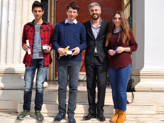 Φωτο επάνω: Οι βραβευθέντες μαθητές, Μιχαλάκης Βάιος (Χρυσό μετάλλιο “Αρχιμήδης”, Α΄Βραβείο “Ευκλείδης”), Τώρος Αθανάσιος (Χάλκινο μετάλλιο “Αρχιμήδης”), Σκαλούμπακα Νικολέττα (Γ΄Βραβείο “Ευκλείδης”) με τον καθηγητή τους, μαθηματικό Στέλιο Τσακουμάγκο.