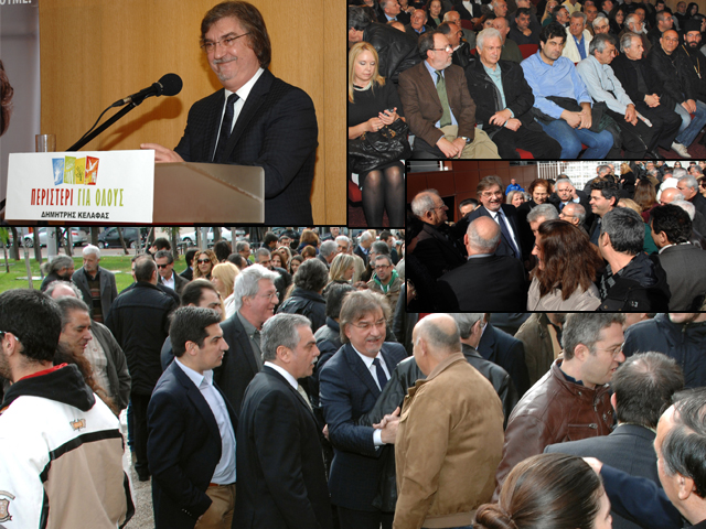Στην ομιλία του ο Δημήτρης Κελάφας άσκησε έντονη κριτική στα πεπραγμένα της δημοτικής αρχής τα τελευταία χρόνια στο Περιστέρι, αλλά και στα μνημόνια και στην πολιτική της κυβέρνησης. Μίλησε χαρακτηριστικά για ένα κράτος που «αντί να είναι αρωγός διώκει» και αναφέρθηκε στις δυνατότητες του δήμου, προκειμένου να ανακουφιστούν οι πολίτες του Περιστερίου από τα προβλήματα που τους δημιουργούν τα αλλεπάλληλα μέτρα. Αυτός είναι και ένας από τους βασικούς άξονες του προγράμματος της παράταξης, που επισήμανε την ανάγκη στήριξης των πολιτών από τη δημοτική αρχή με μέτρα κοινωνικής πολιτικής. «Στο Περιστέρι κανείς δεν πρέπει να μείνει μόνος του απέναντι στην κρίση» δήλωσε.