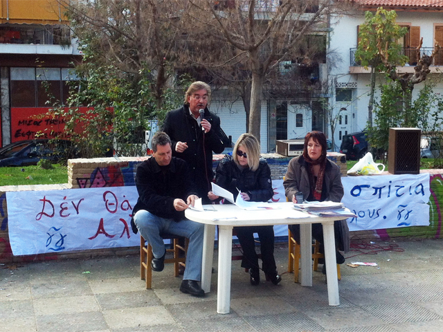 Παρέμβαση του Δημήτρη Κελάφα σε συγκέντρωση που διοργάνωσε η Ομάδα Αλληλεγγύης κατοίκων Λόφου Αξιωματικών Περιστερίου στην πλατεία του Λόφου, την Κυριακή 12 Ιανουαρίου με θέμα «Πλειστηριασμοί-Κατασχέσεις».