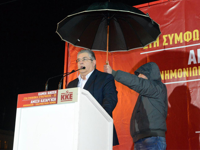 Ενώ για τη συγκέντρωση του ΚΚΕ ανάφερε: «Χαίρομαι που ο λαός δείχνει ξανά το δρόμο του παλλαϊκού αγώνα» και πρόσθεσε πως «προϋπόθεση για να απαλλαγούμε από τον ξένο ζυγό είναι η κατάργηση των μνημονίων μέσα στον ίδιο χώρο στον οποίο ψηφίστηκαν με εντολή των ξένων. Μέσα στη Βουλή των Ελλήνων».