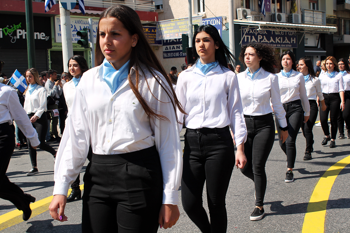 Δημοτικά, Γυμνάσια, Λύκεια, φορείς και σύλλογοι παρέλασαν το πρωί της 25ης Μαρτίου 2019 επι της οδού Παναγή Τσαλδάρη στο Περιστέρι.