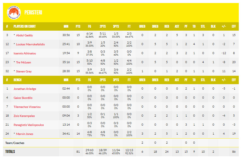 Κορυφαίοι για το Περιστέρι οι Γκάντι, Γκρέι και Μακλιν με 15 πόντους και ο Τζόουνς με 14 πόντους.