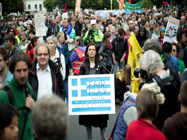 Ορισμένοι διαδηλωτές κρατούσαν επίσης ελληνικές σημαίες ή πλακάτ με συνθήματα υπέρ της Αθήνας. «Η τεχνοκρατική, ψυχρή και νεοφιλελεύθερη Ευρώπη υπό τη διοίκηση της Γερμανίας είναι ανυπόφορη», έγραφε ένα πλακάτ.