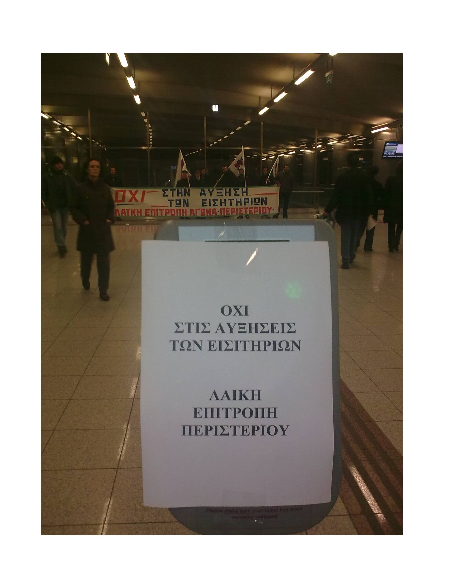 Από το πρωί της Δευτέρας 10 Ιανουαρίου 2011 και πλέον των δυο ωρών εργαζόμενοι, αυτοαπασχολούμενοι, γυναίκες, νεολαίοι της Λαϊκής Επιτροπής Αγώνα Περιστερίου πραγματοποίησαν κινητοποίηση στο σταθμό του Μετρό Αγίου Αντωνίου.
