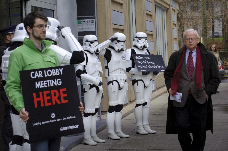 Κατά την είσοδό τους στη συνάντηση, οι εκπρόσωποι των αυτοκινητοβιομηχανιών διέσχισαν μια “φάλαγγα” ακτιβιστών της Greenpeace, μασκαρεμένων σε στρατιώτες της Αυτοκρατορίας στον Πόλεμο των Άστρων, οι οποίου τους καλούσαν να εγκαταλείψουν τη “σκοτεινή” πλευρά των αυξημένων εκπομπών (νύξη σε παλαιότερο διαφημιστικό της γερμανικής Volkswagen).