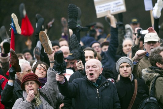 «Θέλουμε μόνο να κρατήσουμε ψηλά τα παπούτσια μας, όχι να τα πετάξουμε», είπε ένας από τους διαδηλωτές, ο Γιούργκεν Γιάνεν, αναφερόμενος στο περιστατικό του 2008 όταν ένας οργισμένος Ιρακινός δημοσιογράφος πέταξε ένα παπούτσι του στον πρώην πρόεδρο Τζορτζ Μπους.