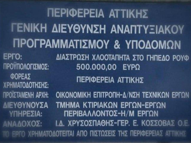 Ολοκληρώθηκε η κατασκευή του έργου της Διάστρωσης χλοοτάπητα στο γήπεδο του Ρουφ από την Περιφέρεια Αττικής. Το έργο, προϋπολογισμού 500.000 ευρώ, χρηματοδοτήθηκε εξ’ ολοκλήρου με ιδίους πόρους και κατασκευάστηκε με την επίβλεψη του Τμήματος κτηριακών έργων – έργων αναπλάσεων – Η/Μ έργων της Διεύθυνσης Τεχνικών Έργων.