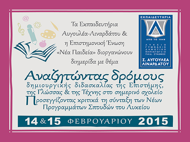 Τα Εκπαιδευτήρια Σ. Αυγουλέα-Λιναρδάτου στο πλαίσιο των καινοτόμων δράσεων και των πρωτοποριακών διαδικασιών που υιοθετούν, πραγματοποιούν διημερίδα που διοργανώνει ο κλάδος των φιλολόγων του Σχολείου, σε συνεργασία με την Επιστημονική Ένωση και το περιοδικό «Νέα Παιδεία» και υπό την αιγίδα του Υπουργείου Πολιτισμού, Παιδείας & Θρησκευμάτων με τίτλο: