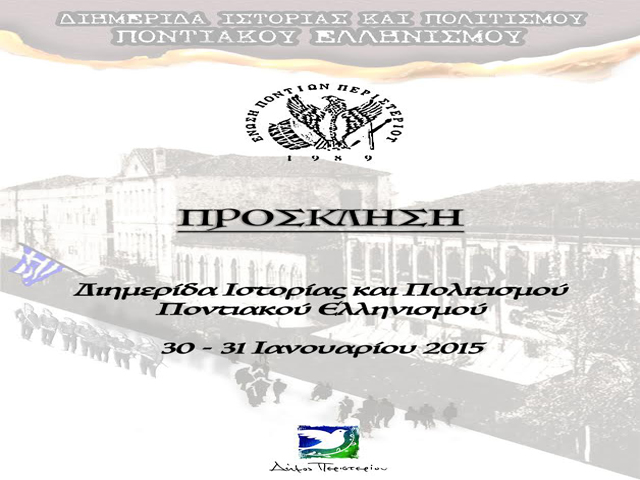 Πρόσκληση στη Διημερίδα Ιστορίας και Πολιτισμού του Ποντιακού Ελληνισμού που θα πραγματοποιηθεί στις 30 & 31 Ιανουαρίου 2015 στην αίθουσα του Πολιτιστικού Συνεδριακού Κέντρου του Δημαρχείου Περιστερίου (Λ. Παναγή Τσαλδάρη 63, στάση ΜΕΤΡΟ: ΠΕΡΙΣΤΕΡΙ).