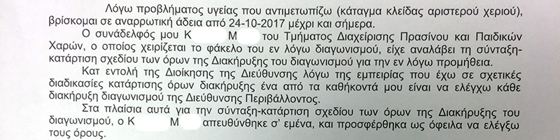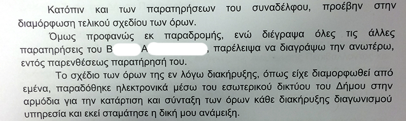 Στο συγκεκριμένο φάκελο κατατέθηκαν και οι επιστολές των δυο εμπλεκόμενων εργαζόμενων του Δήμου Περιστερίου, οι οποίοι συνέταξαν έπειτα από απομακρυσμένη συνεννόηση (διαδίκτυο) συνέταξαν τους όρους της προκήρυξης.