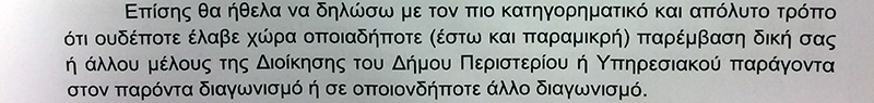 Ενώ και οι δυο εργαζόμενοι ολοκληρώνουν τις επιστολές τους αναφέροντας πως δεν έχει υπάρξει καμία παρέμβαση από μέλη της Διοίκησης του Δήμου Περιστερίου σε αυτόν ή σε κάποιο άλλο διαγωνισμό ζητώντας συγνώμη από τον Δήμαρχο Περιστερίου Ανδρέα Παχατουρίδη και αποδεικνύοντας πως δικαιώνεται έπειτα από τις κατηγορίες τόσο Πολιτικών όσο και Αυτοδιοικητικών παραγόντων.