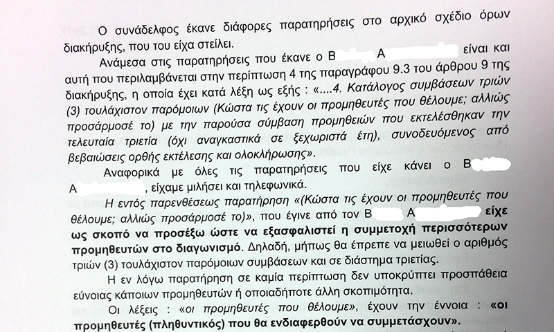 Αναφορικά με την έκφραση «Κώστα τις έχουν οι προμηθευτές που θέλουμε; αλλιώς προσάρμοσέ το…» οι υπάλληλοι αναφέρουν πως η εν λόγω έκφραση χρησιμοποιήθηκε ώστε να γίνουν οι απαραίτητες ρυθμίσεις στην προκήρυξη για να συμμετάσχουν στο διαγωνισμό περισσότεροι προμηθευτές και όχι για να ευνοήσουν κάποιον.