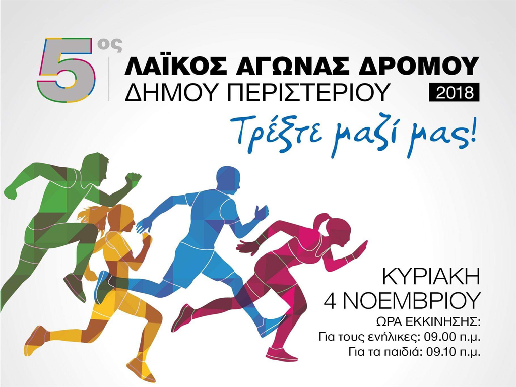 Την Κυριακή 4 Νοεμβρίου 2018 θα πραγματοποιηθεί ο 5ος Λαϊκός Αγώνας Δρόμου του Δήμου Περιστερίου, 1.000 μέτρων για τα παιδιά (ώρα εκκίνησης 9.30 π.μ.) και 10,2 χιλιομέτρων για τους ενήλικες (ώρα εκκίνησης 10.30 π.μ.), με αφετηρία και τερματισμό την πλατεία Δημαρχείου (στάση Μετρό «Περιστέρι»).