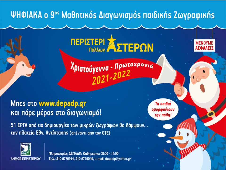 Ο Δήμος Περιστερίου, με ανακοίνωσή του, αναφέρει πως διοργανώνει και φέτος τον 9ο Μαθητικό Διαγωνισμό Παιδικής Ζωγραφικής, με θέμα: «Περιστέρι Πολλών Αστέρων – Χριστούγεννα – Πρωτοχρονιά 2021 – 2022».