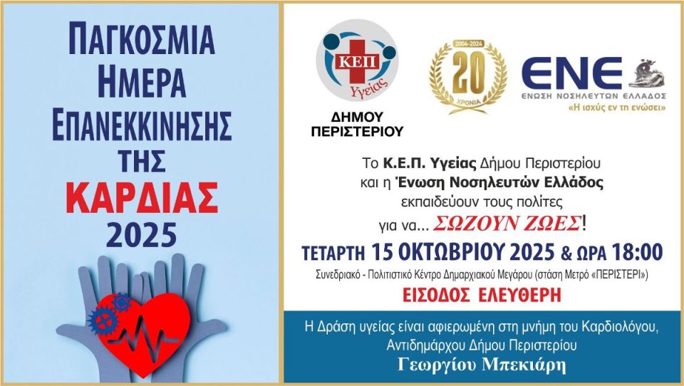 Με αφορμή την Παγκόσμια Ημέρα Επανεκκίνησης της Καρδιάς 2025, ο Δήμος Περιστερίου, μέσω του Κέντρου Ενημέρωσης και Πρόληψης Υγείας (Κ.Ε.Π. Υγείας) και σε συνεργασία με την Ένωση Νοσηλευτών Ελλάδος (Ε.Ν.Ε.), διοργανώνει μία σπουδαία δράση ενημέρωσης και εκπαίδευσης των πολιτών στην καρδιοπνευμονική αναζωογόνηση (ΚΑΡΠΑ).