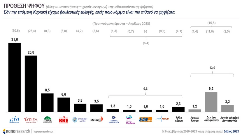 Συγκεκριμένα στην πρόθεση ψήφου, η Νέα Δημοκρατία βρίσκεται στο 31,6% ενώ ο ΣΥΡΙΖΑ στο 25,8%.