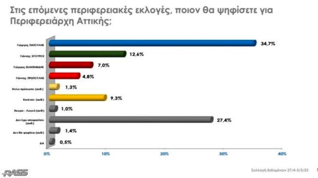 Στο ερώτημα ποιον θα ψηφίσετε για Περιφερειάρχη Αττικής, ο Γιώργος Πατούλης προηγείται με συντριπτικά ποσοστά της τάξης σχεδόν του 35%, ενώ είναι χαρακτηριστικό ότι ο δεύτερος υποψήφιος, ο Γιάννης Σγουρός, ακολουθεί με μόλις 12,6%. Σημειώνεται βέβαια ότι υπάρχει ακόμα ένα μεγάλο ποσοστό αναποφάσιστων, που είναι της τάξης του 27%, αφού οι εκλογές θα γίνουν το Φθινόπωρο.