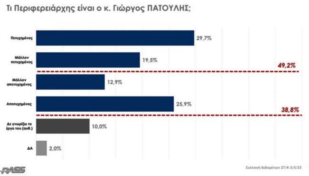 Η “βαθμολογία” των ψηφοφόρων για τον νυν Περιφερειάρχη είναι ιδιαιτέρως θετική και αυτό εξηγεί και την μεγάλη του υπεροχή έναντι των άλλων υποψηφίων. Σε ποσοστό σχεδόν 50%, οι ψηφοφόροι της Περιφέρειας χαρακτηρίζουν τον Γιώργο Πατούλη πετυχημένο και μάλλον πετυχημένο, ενώ αρνητική βαθμολογία του δίνει το 38%.