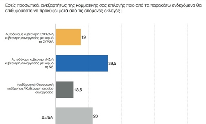 Στο ερώτημα για το τί κυβέρνηση θέλουν οι Έλληνες, το 19% απαντά κυβέρνηση ΣΥΡΙΖΑ (με ή χωρίς συνεργασίες), το 39,5% κυβέρνηση ΝΔ (με ή χωρίς συνεργασίες), ενώ το 13,5% δηλώνει ότι επιθυμεί οικουμενική κυβέρνηση.