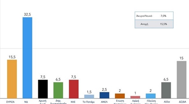 Ειδικότερα, η ΝΔ συγκεντρώνει 32,5% έναντι του 15,5% που συγκεντρώνει ο ΣΥΡΙΖΑ.