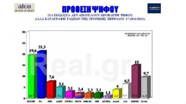 Για πρώτη φορά σε μέτρηση της εταιρείας ALCO προηγείται η ΝΔ. Η διαφορά μεταξύ των δύο μεγάλων κομμάτων φτάνει το 1,7%, ενώ η αποχή φτάνει το 15% και οι αναποφάσιστοι το 9,7%.