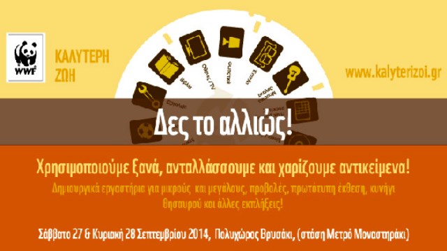 Αυτοσχέδια μουσικά όργανα, κυνήγι θησαυρού, οικολογικά βιβλιοντυσίματα, κατασκευές από σύρμα και ανακυκλώσιμα υλικά, ιδέες για οικολογικά πάρτι, μετατροπές επίπλων, είναι κάποιες από τις δραστηριότητες του φεστιβάλ «Δες το αλλιώς» για την επαναχρησιμοποίηση, ανταλλαγή και δωρεά αντικειμένων, από το πρόγραμμα Καλύτερη Ζωή του WWF Ελλάς, που θα γίνει στις 27 και 28 Σεπτεμβρίου στον πολυχώρο Βρυσάκι, στο Μοναστηράκι.
