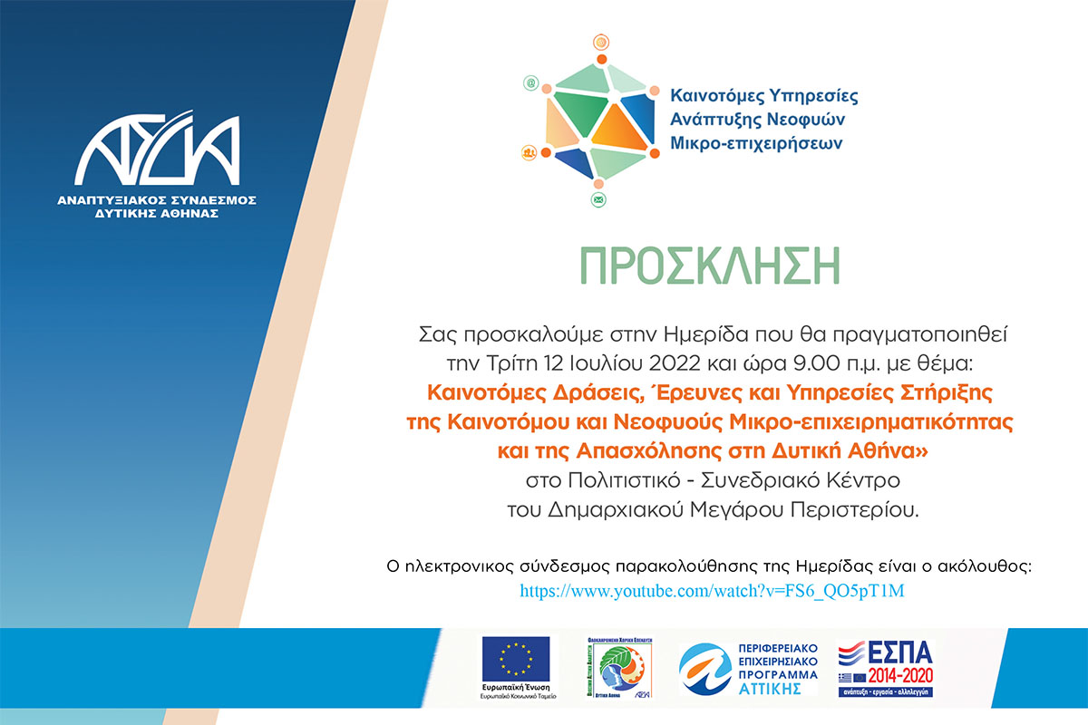 Ο Αναπτυξιακός Σύνδεσμος Δυτικής Αθήνας (ΑΣΔΑ) στο πλαίσιο των Δράσεων Κοινωνικής Ένταξης της ΒΑΑ/ΟΧΕ Δυτικής Αθήνας 2014-2020 υλοποιεί Ημερίδα στήριξης της επιχειρηματικότητας στη Δυτική Αθήνα που θα πραγματοποιηθεί την Τρίτη 12 Ιουλίου, στις 9:00 π.μ. στο Πολιτιστικό – Συνεδριακό Κέντρο του Δημαρχιακού Μεγάρου Περιστερίου με θέμα «Καινοτόμες Δράσεις, Έρευνες και Υπηρεσίες Στήριξης της Καινοτόμου και Νεοφυούς Μικρο-επιχειρηματικότητας και της Απασχόλησης στη Δυτική Αθήνα»