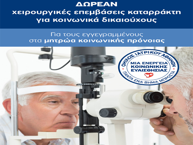 Το Ιατρικό Περιστερίου, σε συνεργασία με τον Δήμο Περιστερίου, προσφέρει δωρεάν χειρουργικές επεμβάσεις καταρράκτη σε δημότες που έχουν οικονομική αδυναμία.