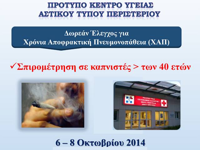 Δωρεάν έλεγχος για Χρόνια Αποφρακτική Πνευμονοπάθεια (ΧΑΠ) με σπιρομέτρηση σε καπνιστές άνω των 40 ετών, θα πραγματοποιηθεί στο πρότυπο Κέντρο Υγείας Αστικού Τύπου Περιστερίου, από Δευτέρα 6 έως Τετάρτη 8 Οκτωβρίου 2014.