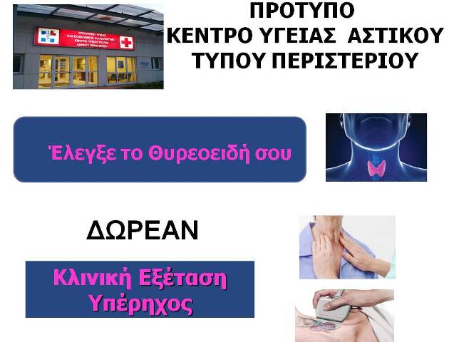 Δωρεάν κλινική εξέταση υπέρηχου “Έλεγξε το Θυρεοειδή σου” θα πραγματοποιηθεί στο πρότυπο Κέντρο Υγείας Αστικού Τύπου Περιστερίου, από τις 24 – 26 Ιουνίου 2014.