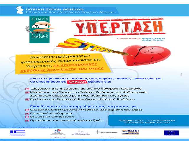 Ο Δήμος Αγίας Βαρβάρας σε συνεργασία με την Ιατρική Σχολή Αθηνών εφαρμόζει ένα καινοτόμο πρόγραμμα μη φαρμακευτικής αντιμετώπισης της υπέρτασης, με επιστημονικές μεθόδους διαχείρισης του άγχους.