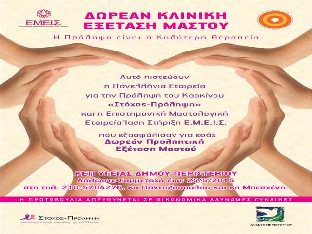 Ο Εντεταλμένος Δημοτικός Σύμβουλος Περιστερίου σε θέματα Υγείας, Ιατρός Καρδιολόγος Γεώργιος Μπεκιάρης ανακοινώνει ότι ο Δήμος Περιστερίου σε συνεργασία με τις Μη Κερδοσκοπικές Εταιρείες, Πανελλήνια Εταιρεία για την πρόληψη του Καρκίνου «Στόχος–Πρόληψη» και Επιστημονική Μαστολογική Εταιρία Ίαση Στήριξη «Ε.Μ.Ε.Ι.Σ.», θα διενεργήσουν Δωρεάν Προληπτική Εξέταση Μαστού για τις οικονομικά αδύναμες γυναίκες.